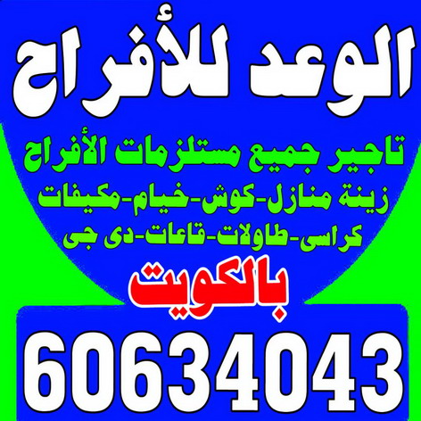 أفراح ومناسباتتاجير كراسى – تاجير قاعات ملكية – مكتب الوعد للافراح 60634043 – كوش افراح – تاجير مكيفات – تاجير كراسى وطاولات – تاجير دى جى – خدمة ضيافة